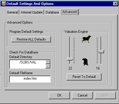 The Advanced Tab on the Default settings panel will allow the reset of all program default values. Press RESTORE ALL DEFAULTS Button the restart Valuator program.