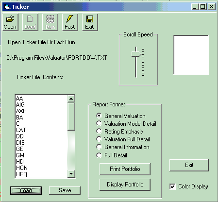 Auto Display Uses the default Ticker File To display the Tickers in the Valuator window. The Auto Display may be stopped by selecting the STOP Button.